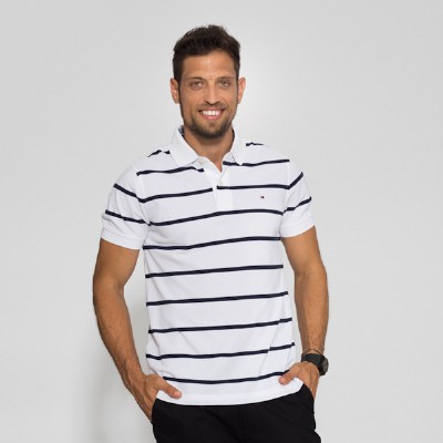 חולצת פולו טומי הילפיגר לבן פסים כחולים- Custom fit